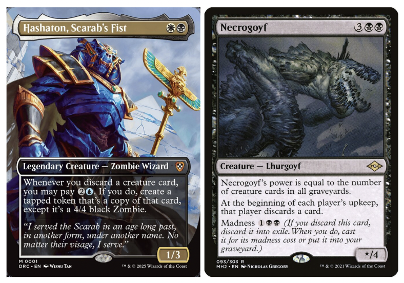 R: El efecto de copia de Hashaton modifica la fuerza/resistencia de la criatura. Cuando un efecto de copia modifica una característica, no copia ninguna habilidad que defina esa característica, así que no copia habilidad de Necrogoyf, la ficha es 4/4.