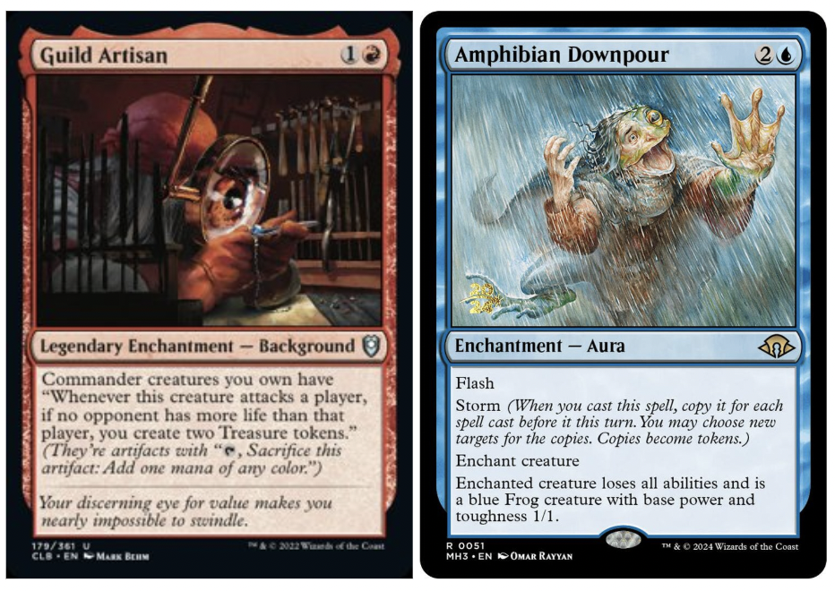 P: Me gustaría saber cómo interactúan Guild artisan y Amphibian downpour en commander. ¿Influye el orden en que entren al campo? ¿Un comandante rana 1/1 pone tesoros al atacar al oponente con más vida, o perdió la habilidad con el aura?