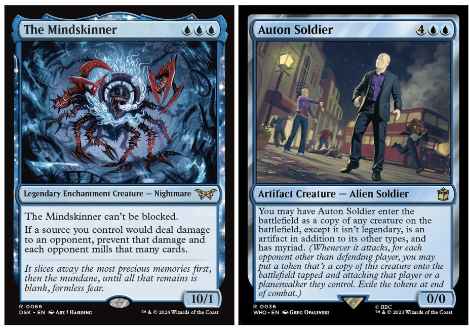 P: Una duda jueces. Si tengo un Desollamentes en mesa en una partida de Commander, y una copia hecha por un Auton soldier. ¿Cada oponente millea 40 cartas (contando que la copia tiene myriad), u 80? Gracias